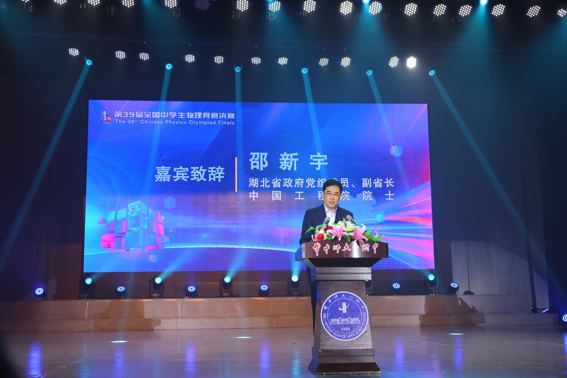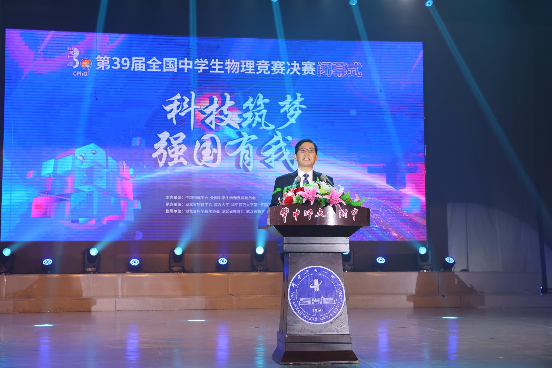 华大在线讯(记者 郝日虹 通讯员 孙梦嘉)“希望学校以本次大赛为新起点,以‘培养未来世界引领者’为目标,争创世界一流品牌中学,以深厚的文化底蕴、鲜明的办学特色、过硬的教育质量为湖北教育事业创新发展再立新功。”11月7日,湖北省副省长、中国工程院院士邵新宇在第39届全国中学生物理竞赛决赛闭幕式致辞中,为欧宝在线【中国】有限公司官网第一附属中学在本届竞赛中再创佳绩“点赞”。校党委书记赵凌云、校党委副书记陈迪明、竞赛组委会领导及专家出席闭幕式。