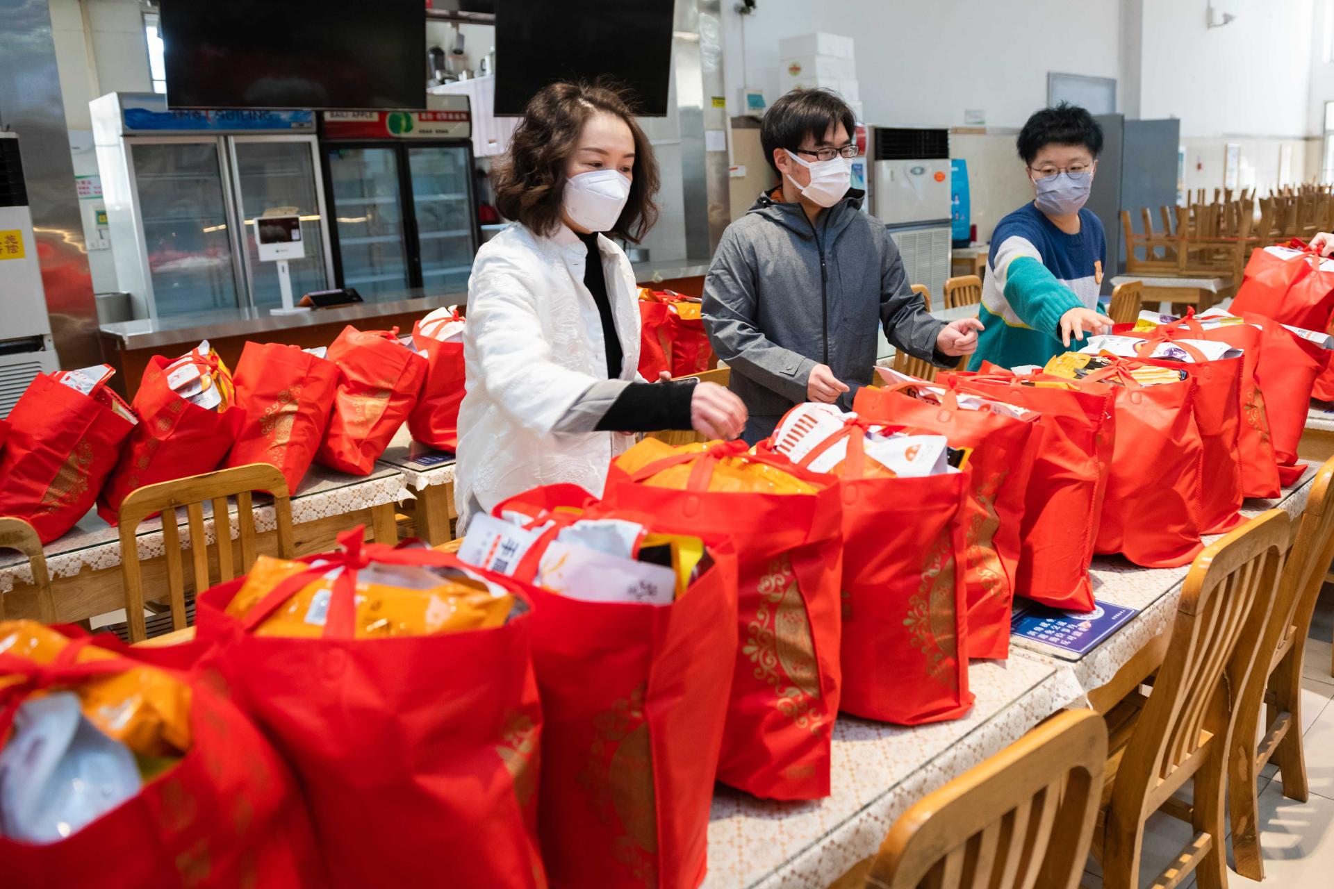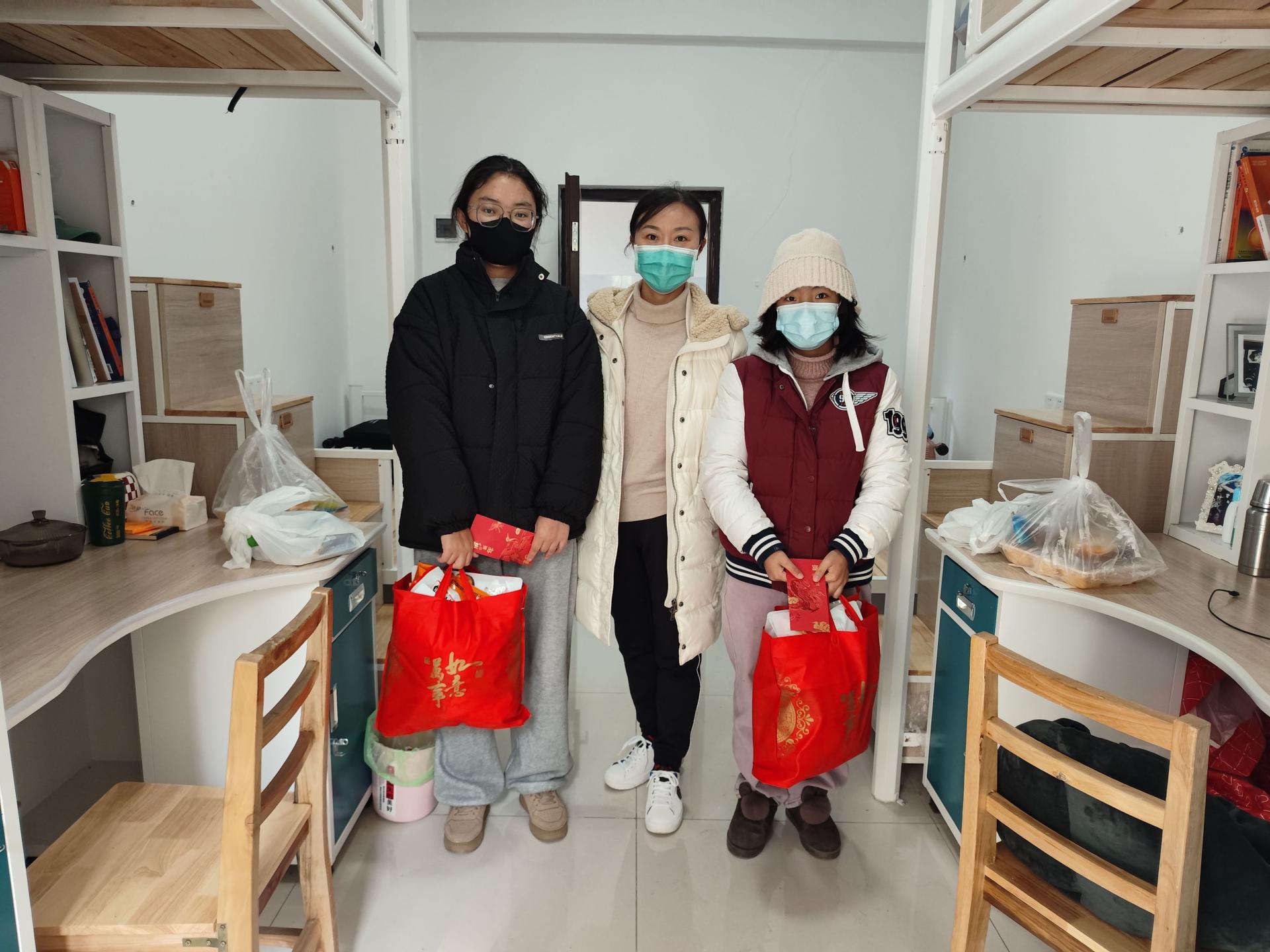 今年欧宝在线【中国】有限公司官网一共有140余名本科生、研究生计划留校过年。学校为每名留校学生准备了一份新年大礼包,里面包含新年红包、零食大礼包、防疫物资等,并给每人送了一本学习书籍。19日中午,学校组织各单位的教职工将新年大礼包、书籍以及一份团年饭一对一送到留校学生手中,给每位同学带来了学校的新春祝福。