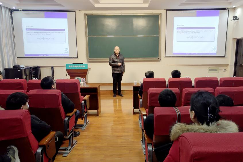 论坛期间,多位院士应邀作专题报告,为学院师生带了数场精彩的学术盛宴。张平院士做客“数苑博雅讲座”,以《3-D anisotropic vs classical incompressible Navier-Stokes systems》为题,介绍了三维各向异性和经典不可压Navier-Stokes方程组的研究现状及其取得的突破性进展。徐宗本院士以《如何学习学习方法论——AI for AI的一个尝试》为题,以基本的先验假设为切入点揭示了“实现机器学习自动化”是人工智能发展的必然趋势。汤涛院士以《不确定性量化与科学计算》为题,围绕不确定性的广泛性、不确定性量化与科学计算等进行了系统介绍。