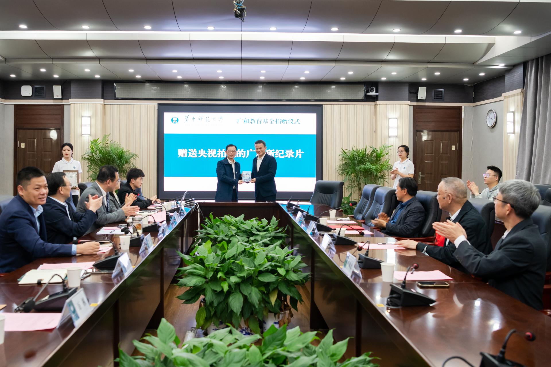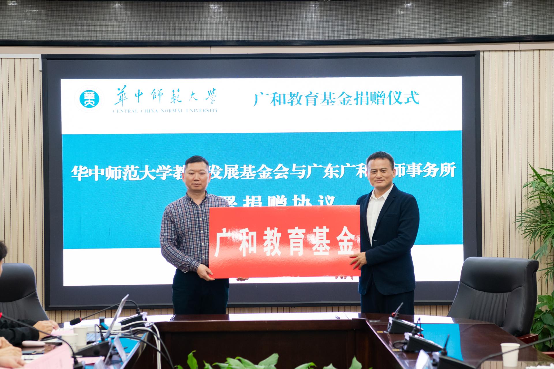 华大在线讯(通讯员 吴国栋 徐静宜)4月3日,广和教育基金捐赠仪式在行政楼一楼会议室举行。校党委书记夏立新、广东广和律师事务所首席合伙人童新出席,学校教育发展基金会、法学院和广和律师事务所相关负责同志以及师生代表参加。