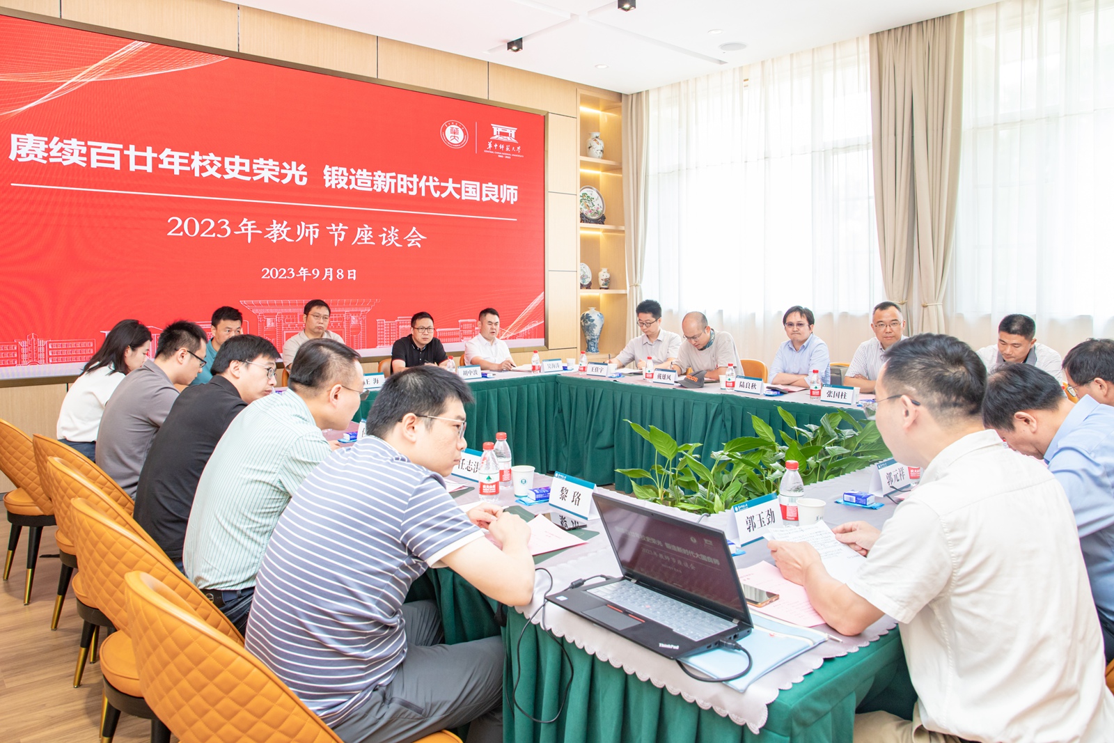 华大在线讯(见习记者 周兴权)9月8日,在第39个教师节来临之际,“赓续百廿年校史荣光,锻造新时代大国良师”——2023年教师节座谈会在桂香园三楼会议室举行。副校长任友洲与一线优秀教师代表座谈交流,倾听教师心声,共谋学校发展,本科生院、科技处、社科处、人事部等职能部门负责人参加座谈。