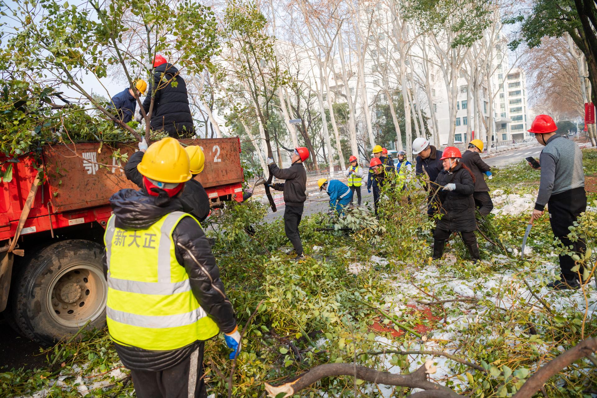 后勤保障部相关负责人介绍说,目前学校已紧急调用了2台高空作业车、1台粉碎车、1台挖掘机和6台清运车,由副校长任友洲和校党委副书记、纪委书记刘继文分别带队,从2月8日到9日,连夜对校园主干道等重点路段和区域的枯枝落叶进行清理,同时做好校园清洁工作,全力以赴让师生在干净整洁的校园中迎来春节。
