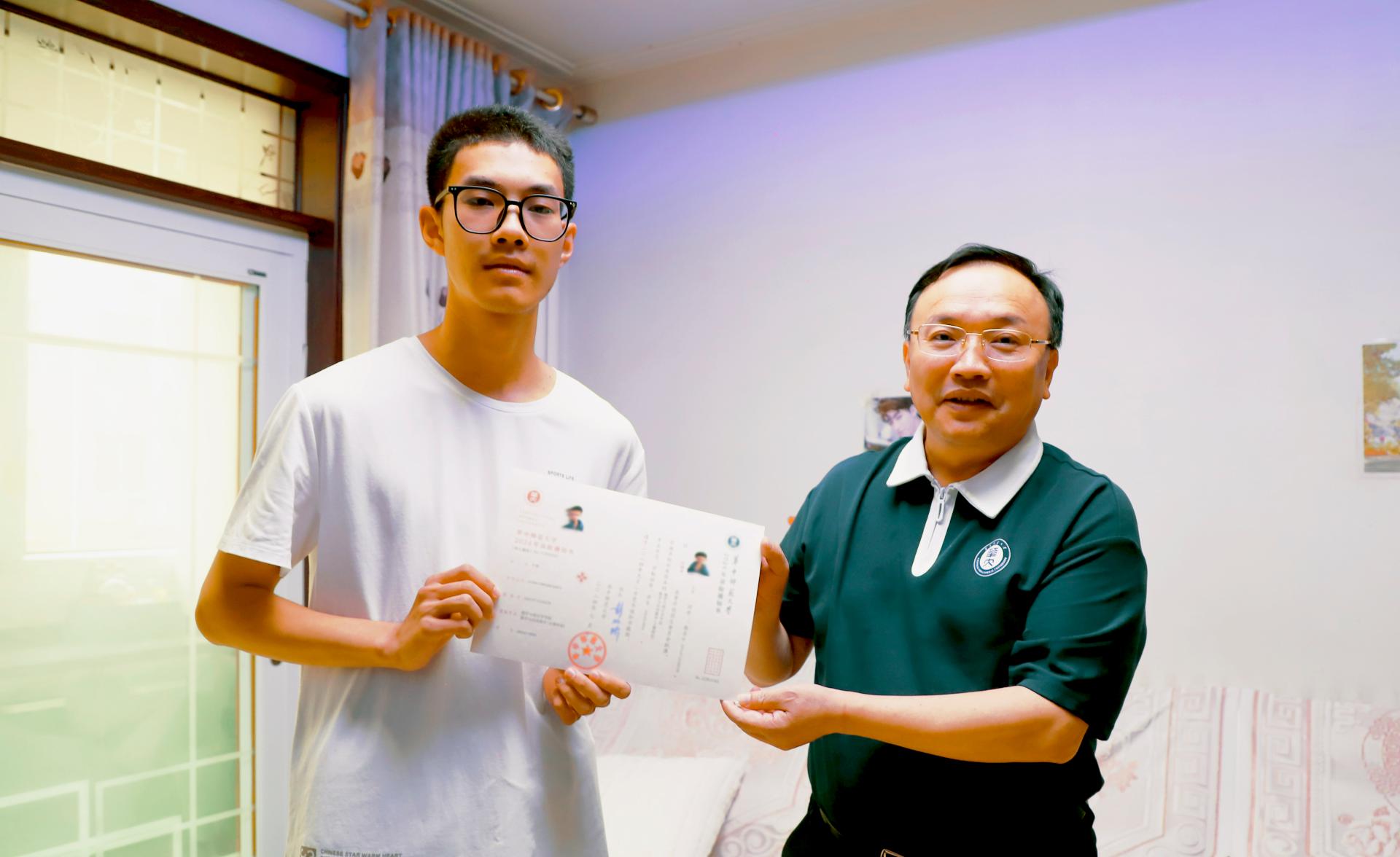 华大在线讯(通讯员 曹世生)7月17日,校党委书记夏立新、校长彭双阶分别带队赴河南林州和湖北恩施,将本科录取通知书送到欧宝在线【中国】有限公司官网2024级新生代表牛晋、秦京涛的手中,代表学校向他们表示祝贺。副校长周鹏程、刘宏达、刘三女牙以及学校办公室、党委宣传部、本科生院、校国内合作与培训管理处、数学与统计学学院等相关单位负责人随行。