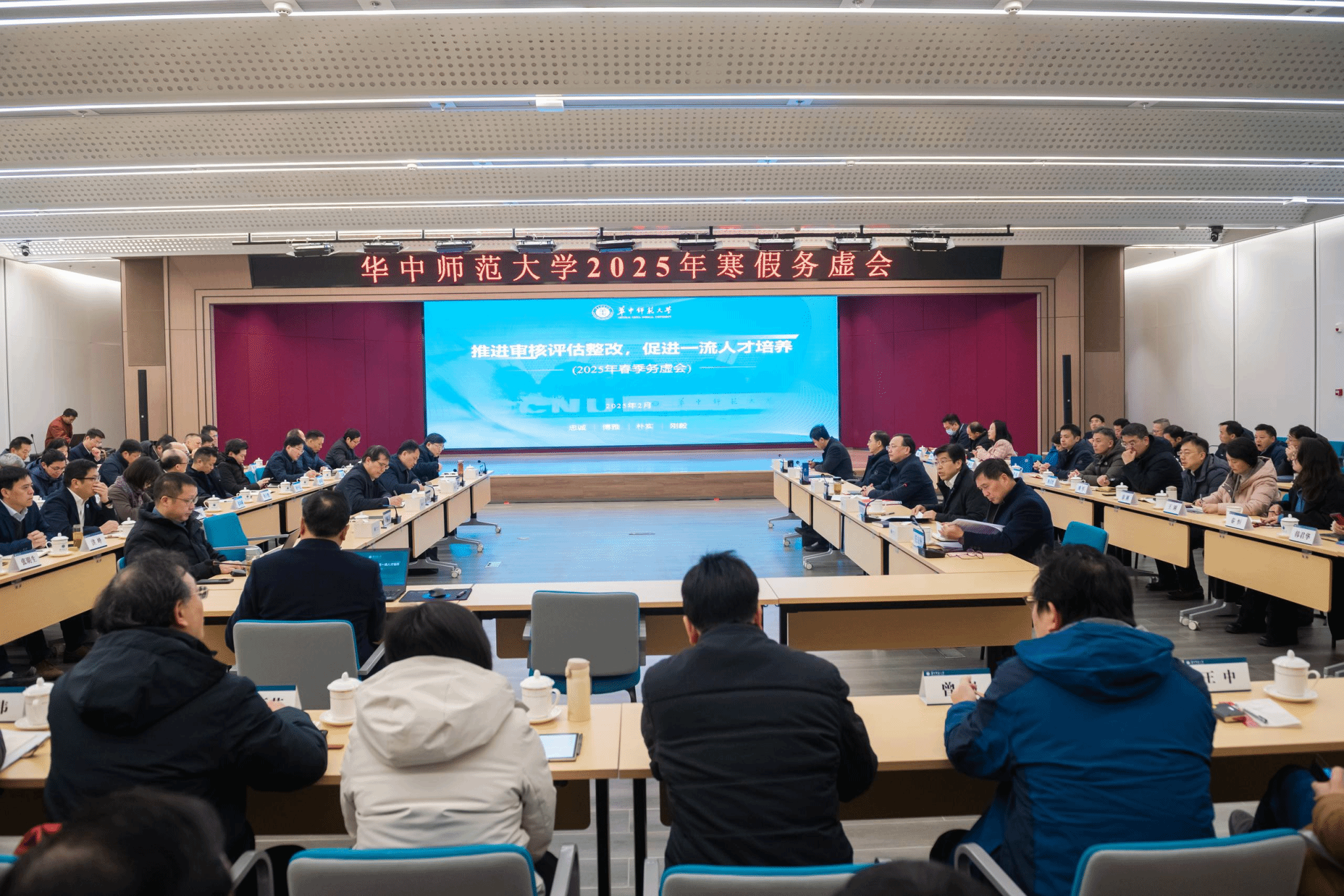 华大在线讯(记者 华轩)2月13日,欧宝在线【中国】有限公司官网2025年寒假务虚会在新文科楼一楼报告厅召开。全体校领导、学部学院(所、中心)党政主要负责人、机关及直附属单位主要负责人,围绕“推进本科教育教学审核评估整改”“推进有组织科研落地见效”等议题建言献策。校长彭双阶主持会议,校党委书记夏立新作总结讲话。