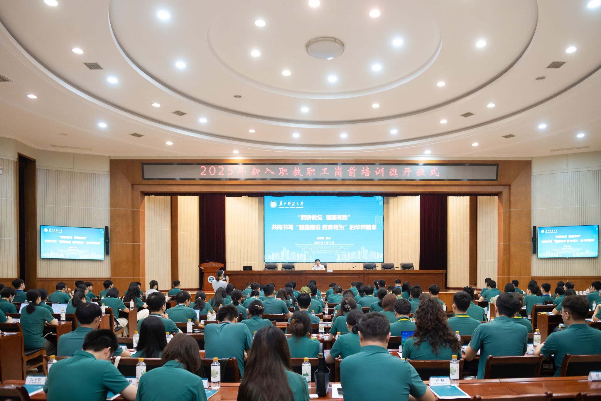 华大在线讯(通讯员 宋一帆)7月4日,学校2025年新入职教职工岗前培训班开班式在科学会堂一楼报告厅举行。校长彭双阶,副校长李鸿飞,人事处、教师教育学院主要负责人及140余名参训学员出席开班式。