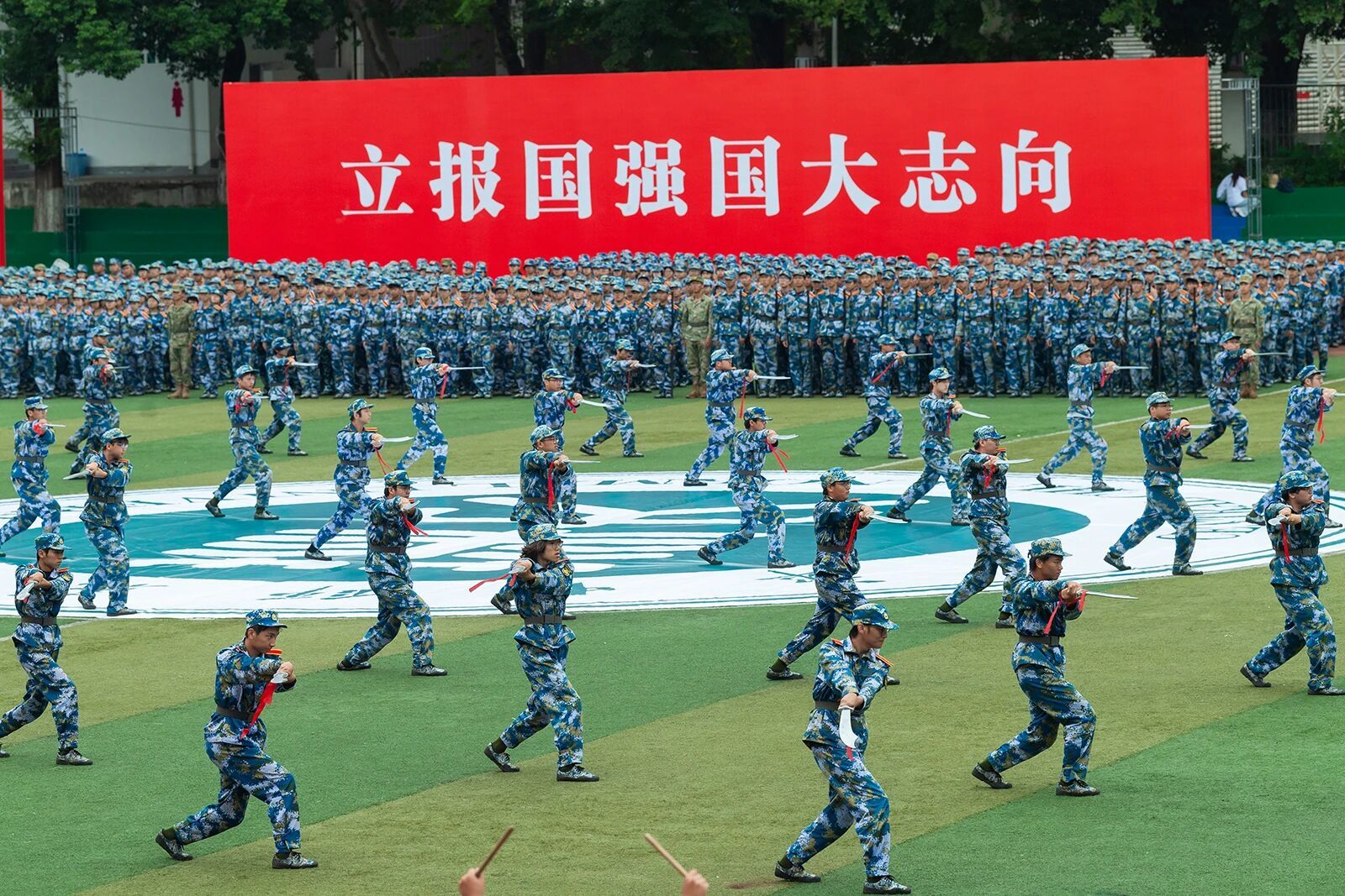 开学典礼后,2025级本科新生进行军训总结汇报表演。由各连队选派的优秀学员组成的方阵正步走过主席台。整齐的步伐踏出青春的坚毅,嘹亮的口号传递昂扬的力量。各方阵带来破锋八刀、匕首操、应急棍术、战术综合演练等表演项目,学员们挥臂出拳皆带千钧力道,转身踢腿尽显利落姿态,招式衔接更藏十足默契,展现了军训磨砺的扎实成果,定格下桂子新人的奋进印记。