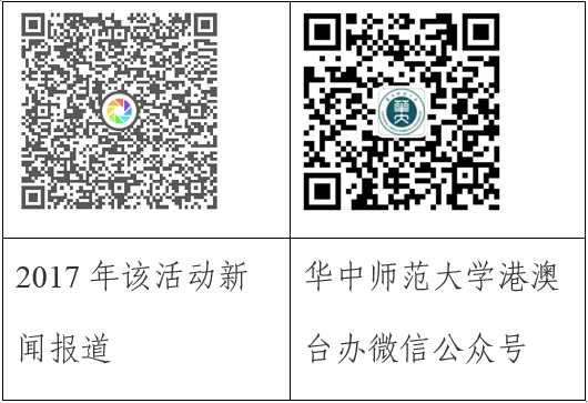 3.该活动往年有关报道可扫描下方二维码了解,也可参阅“欧宝在线【中国】有限公司官网港澳台办”微信公众号或港澳台办网站hmt.ccnu.edu.cn。关于2018年活动详情可咨询国际处(港澳台办)汪亭亭老师、校团委陶力老师。