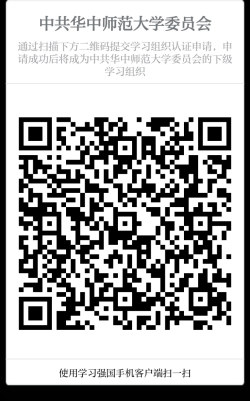 各分党委(党总支)学习管理员打开“学习强国”APP——进入下方左侧“消息”页面——点击右上角“+”——点击“扫一扫”,扫描下方二维码,提交认证申请——等候学校党委确认申请信息并进行审批——申请状况变更为“通过”即完成认证。