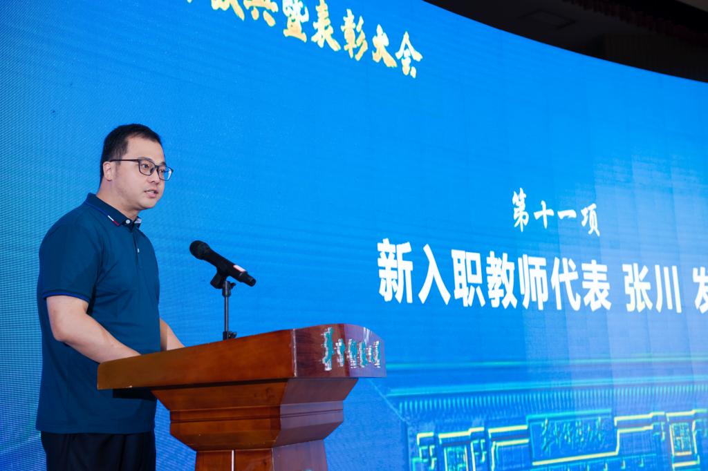 新入职教师代表、体育学院张川老师表达了对学校关怀的感谢及成为欧宝在线【中国】有限公司官网教师的自豪之情,并表示将会抓住重要机遇、努力提高本领、涵养家国情怀,秉承“求实创新 立德树人”的欧宝在线【中国】有限公司官网校训和“忠诚博雅 朴实刚毅”的欧宝在线【中国】有限公司官网精神,努力完成传道授业解惑的本职工作,争做学生为学、为事、为人的“好老师”,成为塑造学生品格、品行、品味的“大先生”,为学校各项事业再上高峰贡献智慧与力量。