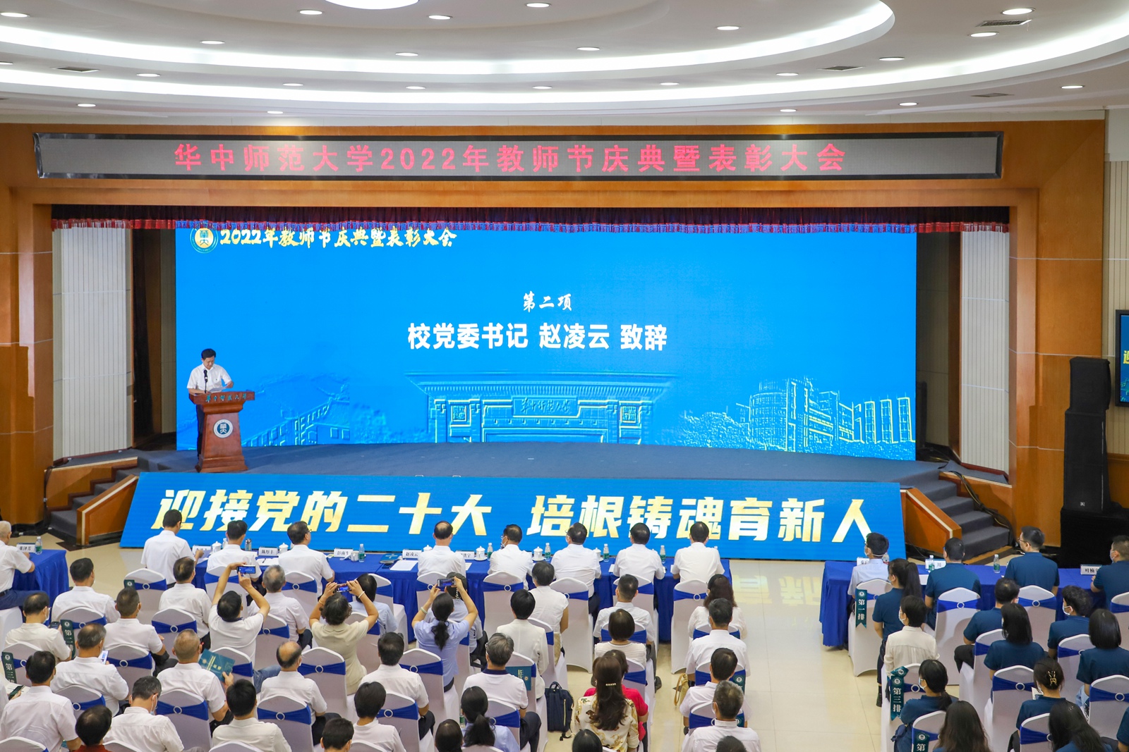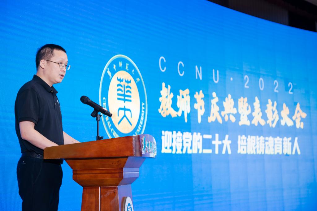 华大在线讯(记者 华轩)9月9日,学校2022年教师节庆祝暨表彰大会在科学会堂一楼报告厅举行。全体在校校领导,重要荣誉和奖项获得者,荣休教职工、从教三十年、四十年教职工,新入职教师,各单位负责人,学生代表参会。会议由副校长李鸿飞主持。