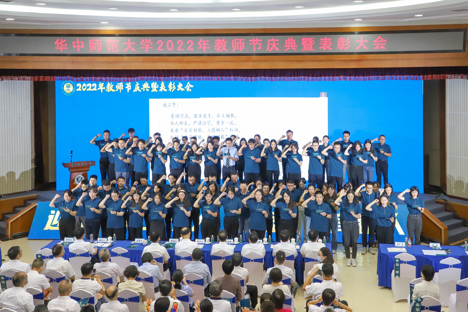 “我宣誓:爱国守法,敬业爱生,弘文励教。为人师表,严谨教学,勇争一流。秉承‘求实创新 立德树人’校训和‘忠诚博雅 朴实刚毅’精神。忠诚教育事业,铸就高尚师德,恪尽教师职责……”在物理科学与技术学院秦广友教授的领誓下,全体2022年新入职教师用响亮的声音进行了入职宣誓。