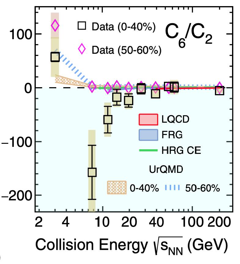 该实验研究分析了高能重离子对撞机自2010年起近十年采集的海量的实验数据,对净质子数分布的高阶累积矩进行测量。实验测量发现,0-40%中心碰撞的六阶累积矩(C6/C2)随着碰撞能量的降低逐渐变为负值,但在最低碰撞能量3 GeV时变为正值。实验观测到的负的六阶累积矩以及各阶次的层级(hierarchy)现象与从第一性原理出发的格点QCD的计算结果相符合,揭示出高能核碰撞中热化夸克胶子等离子体已经形成且强子相和夸克物质相为平滑穿越。最低能量与高能量在测量值和符号都显示出明显差异,意味着热密核物质状态方程发生了明显的改变,3-20 GeV将是第二阶段能量扫描搜寻QCD相变临界点的重点能区。