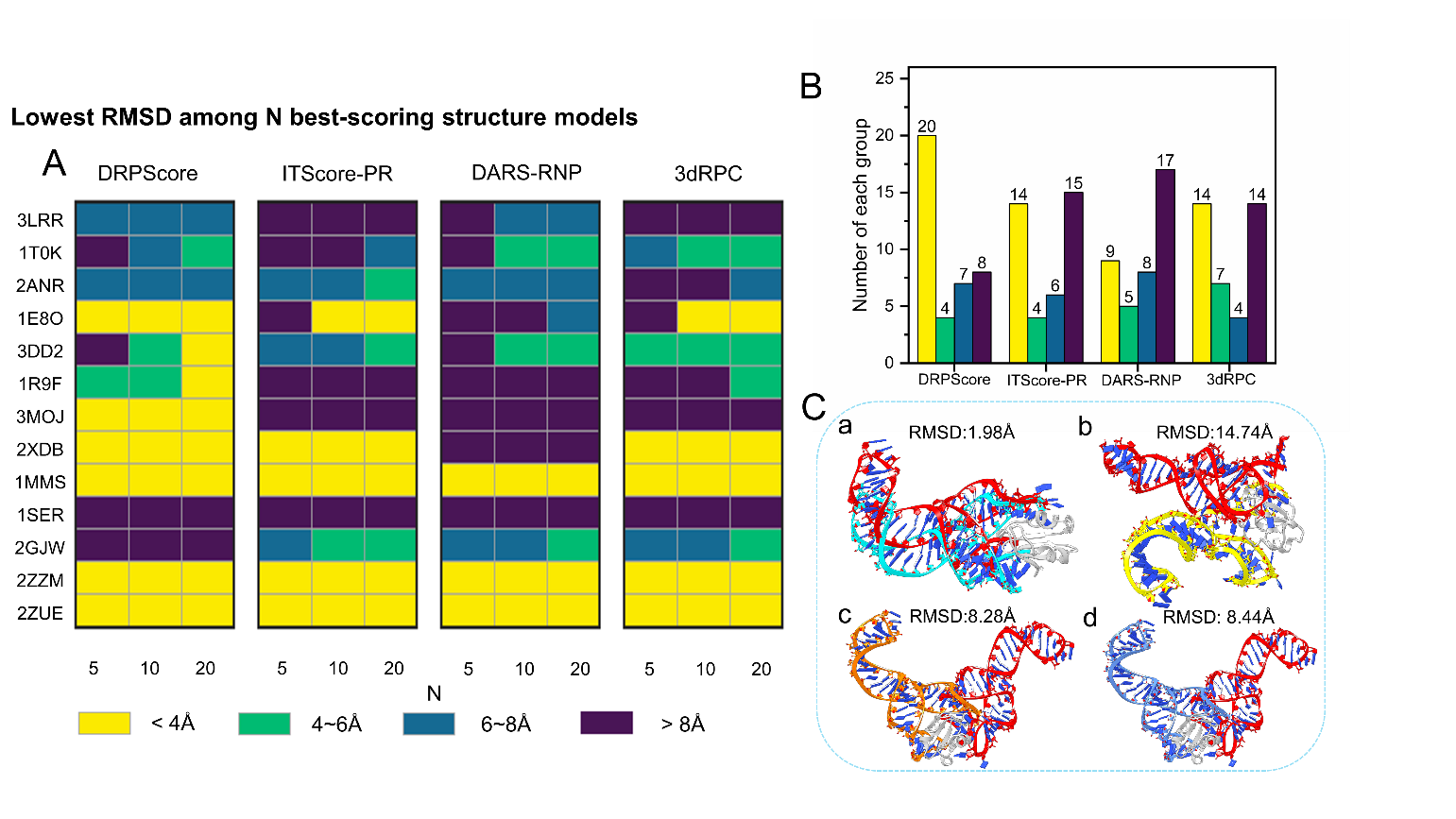 图2. 柔性对接测试集结果。黄色为近天然态结构,DRPScore的预测精度显著高于传统模型