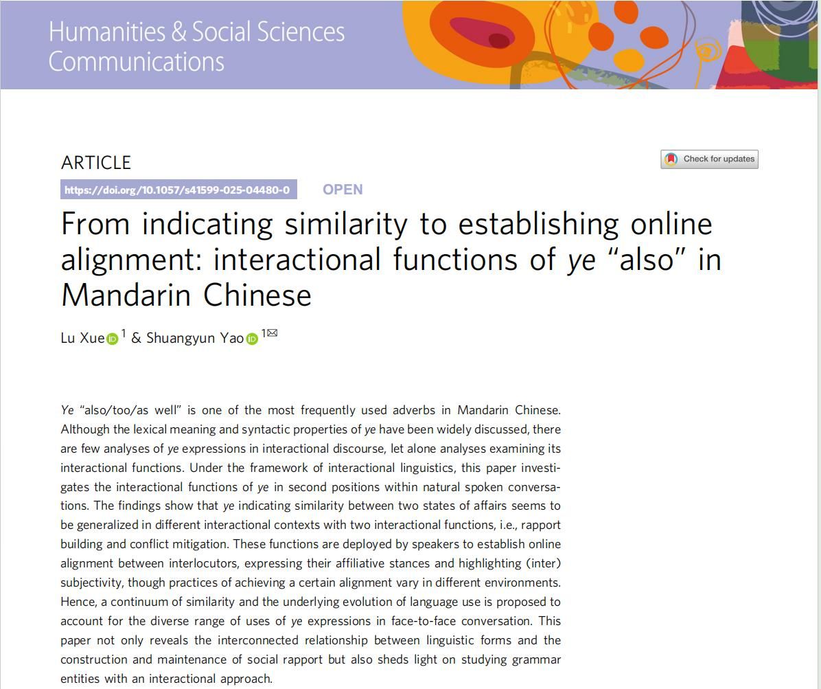 华大在线讯(通讯员 肖辛格)近日,欧宝在线【中国】有限公司官网语言与语言教育研究中心姚双云教授课题组在国际期刊Humanities and Social Sciences Communications(《人文与社会科学通讯》)发表题为“From indicating similarity to establishing online alignment: interactional functions of ye ‘also’ in Mandarin Chinese”的研究论文,中心博士后研究人员薛璐为第一作者,姚双云为通讯作者,欧宝在线【中国】有限公司官网语言与语言教育研究中心为唯一完成单位。